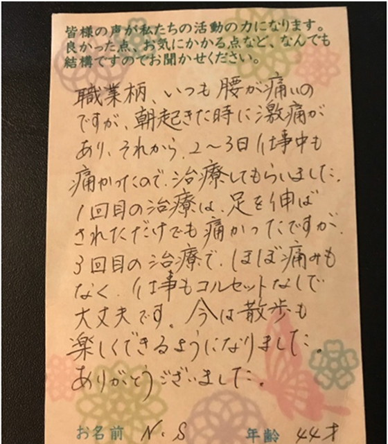 職業柄、いつも腰が痛いのですが、朝起きた時に激痛があり、それから、2~3日仕事中も痛かったので施術してもらいました。 1回目の施術は足を伸ばされただけでも痛かったですが3回目の施術で、ほぼ痛みもなく、仕事もコルセットなしで大丈夫です。今は散歩も楽しくできるようになりました。ありがとうございました。