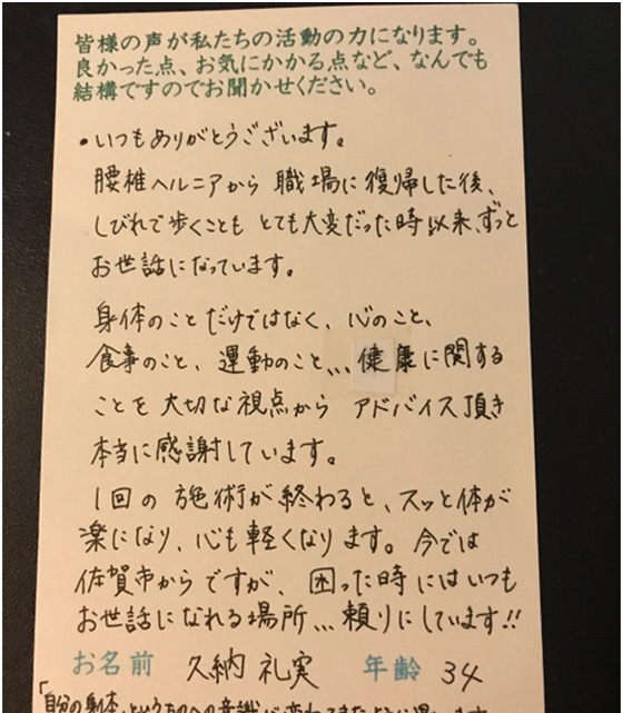 右腰椎ヘルニアから職場復帰した後しびれで歩くこともとても大変だった時以来ずっとお世話になっています。 身体のことだけではなく、心のこと、食事のこと、運動のこと…健康に関することを大切な視点からアドバイス頂き本当に感謝しています。 1回施術が終わると、スッと体が楽になり、心も軽くなります。今では佐賀市からですが、困ったときにはいつもお世話になれる場所…頼りにしています!!   自分の身体というものへの意識が変われてきたように思います。